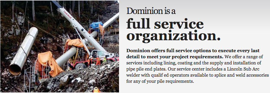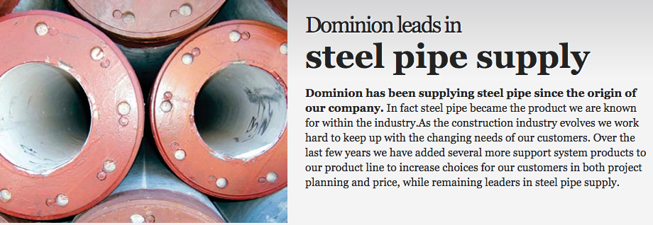 Dominion Pipe and Piling is a division of Varsteel Ltd., a company that has been in the steel service center business since 1953 in Canada. The Dominion name has been in the steel industry since 1970, and officially changed its name to Dominion Pipe and Piling in 2004.